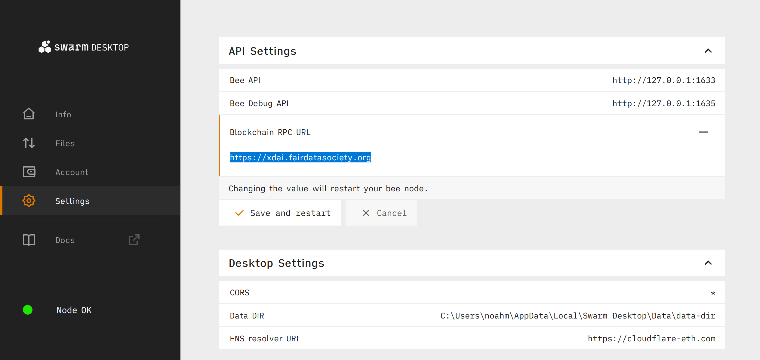 From the Settings tab, expand the API Settings section and click the pen button next to Blockchain RPC URL to edit the default RPC. You can choose any valid Gnosis Chain RPC, either from your own Gnosis node or a service provider. You can find a list of paid and free RPC options from the Gnosis Chain docs. For this example we will use the free endpoint - https://xdai.fairdatasociety.org.