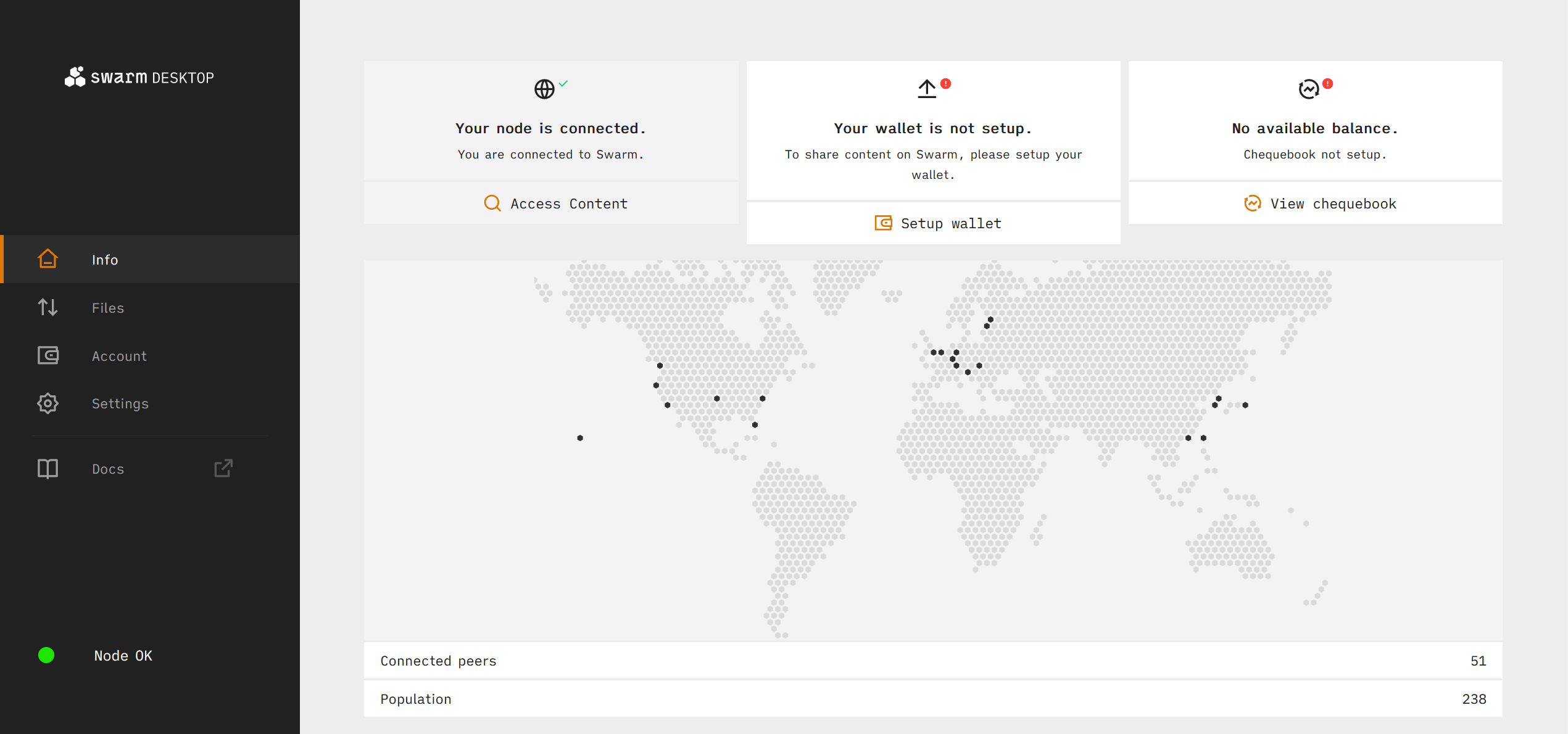 To get started, navigate to the Info tab and click the Setup wallet button. Click Use xDAI. Confirm that you have sufficient xDAI balance and click Proceed. Click Swap Now and Upgrade. Wait for the upgrade to complete. After the upgrade is complete, you will see several new sections within the Account tab: Chequebook, Stamps, and Feeds.