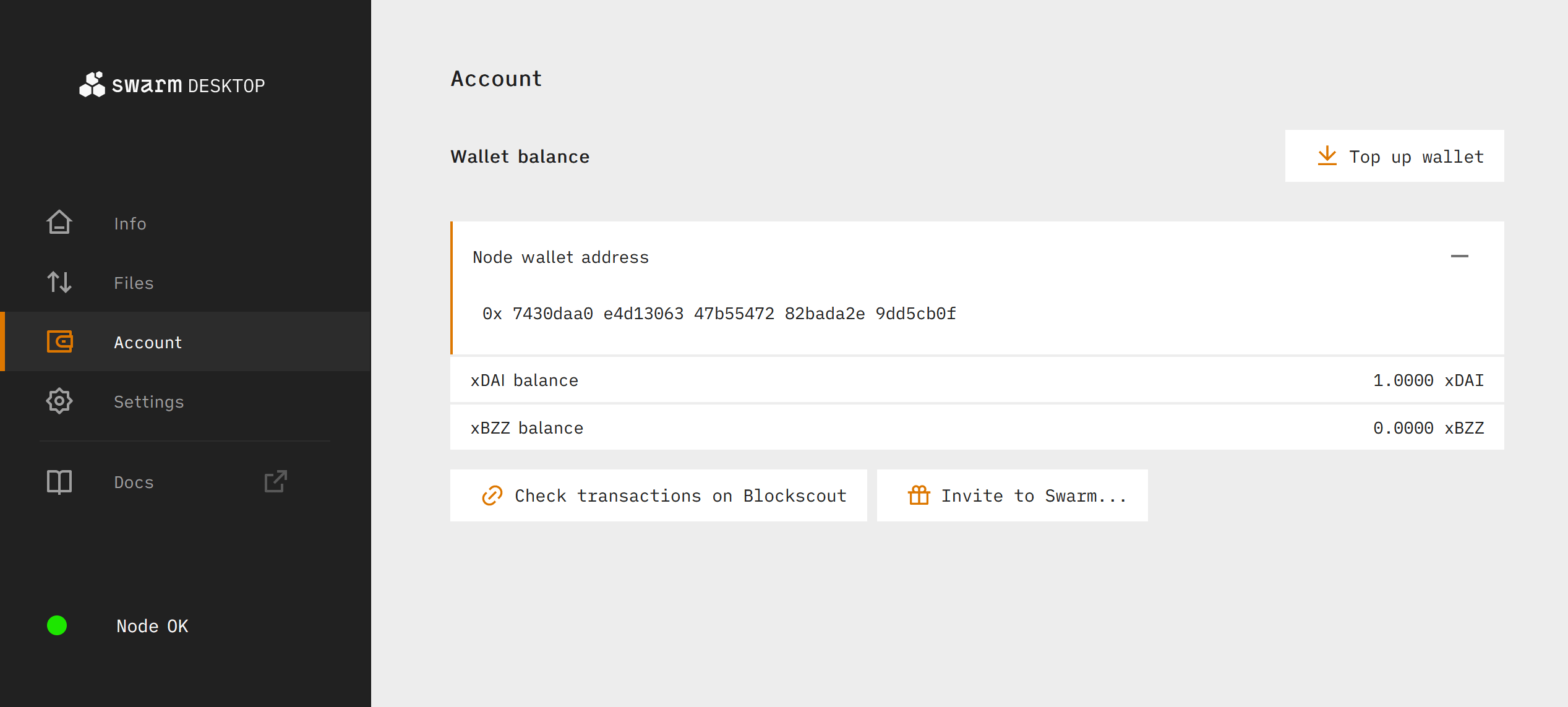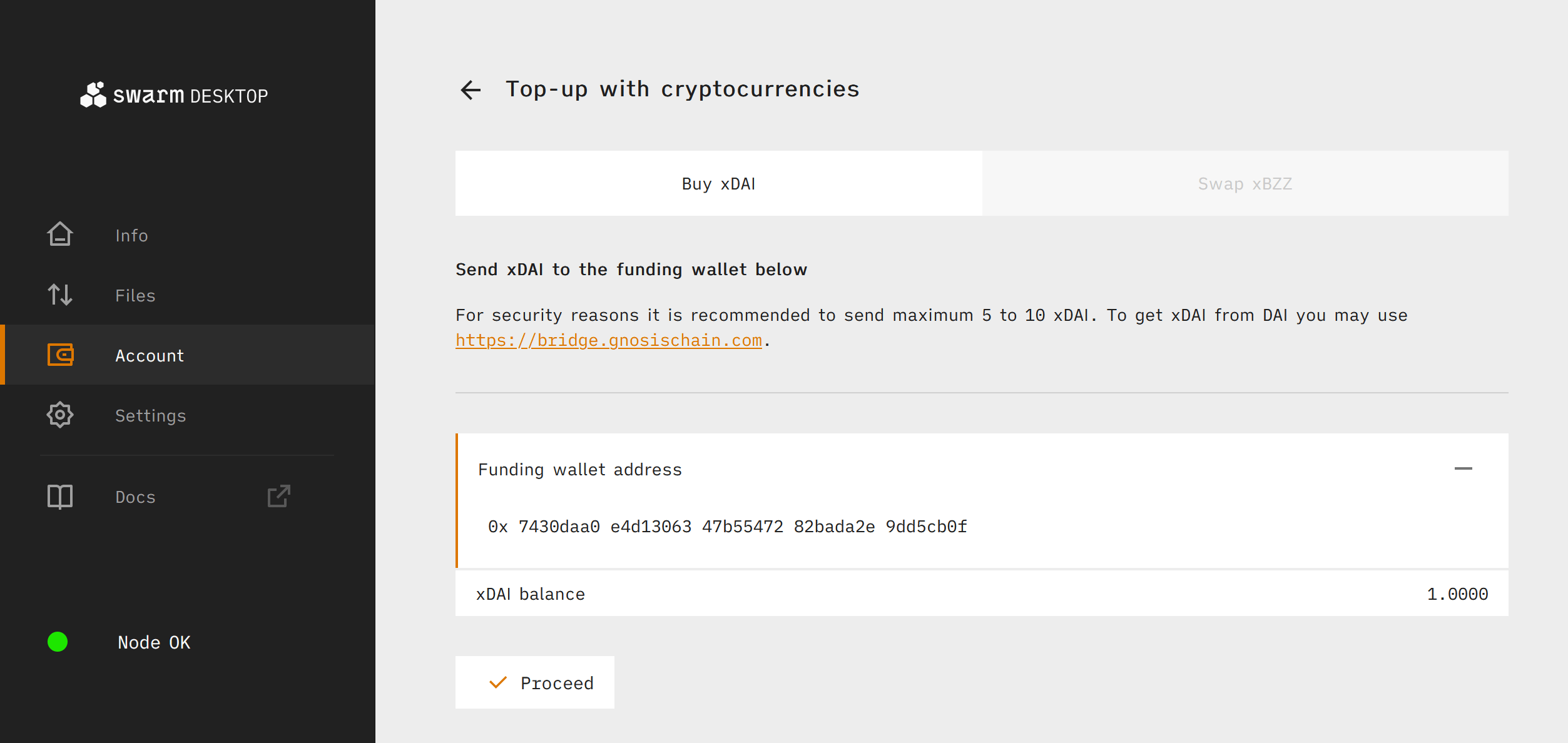 Bee ultra-light nodes are limited to only downloading small amounts of data from Swarm. In order to download greater amounts of data or to upload data to Swarm you must upgrade to a light node. To do this we need to first fund our Swarm Desktop Bee node with some xDAI (DAI bridged from Ethereum to Gnosis Chain which serves as Gnosis Chain's native token for paying transaction fees) in order to pay for the Gnosis Chain transactions required for setting up a light node.